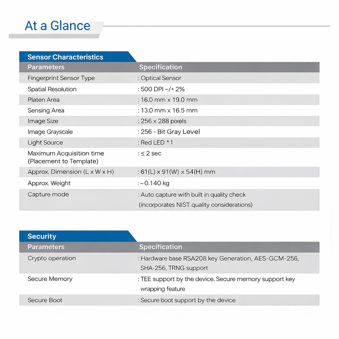 The MFS110 is a compact and elegant fingerprint device used for identification, verification, and authentication purposes. It ensures secure biometric data handling and reliable recognition using unique fingerprint technology. The device is quick, user-friendly, and can serve as a secure alternative to passwords or PIN-based authentication methods.